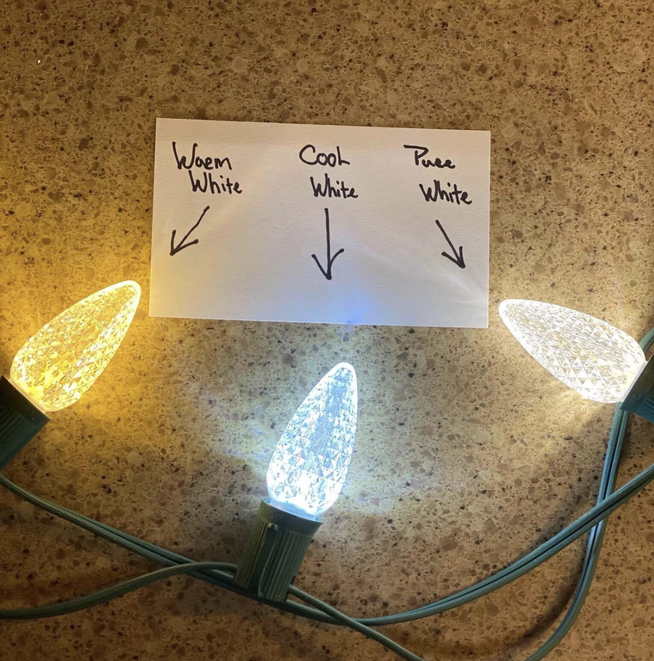 C9 bulbs are available in 3 different white light tones: warm white, cool white, and pure white.